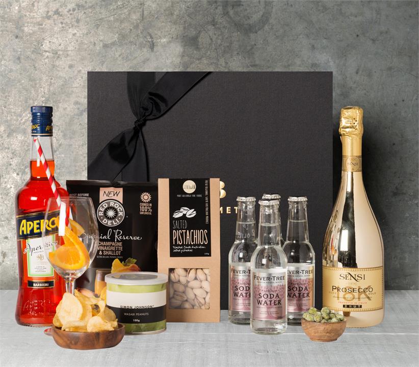 The vibrant orange colour of the Aperol Spritz will catch their eye and the bitter-sweet aftertaste adds a lovely balance to the initial burst of sweetness, making it a well-rounded and enjoyable drink. The hamper also includes a carefully curated selection of snacks perfect to accompany an Aperol Spritz, just like they would serve in Italy. And to make the gift even more special it comes beautifully presented in Gourmet Basket signature packaging adding a touch of sophistication to your gift-giving. So go ahead and treat yourself or a loved one to the delightful taste of an Aperol Spritz!