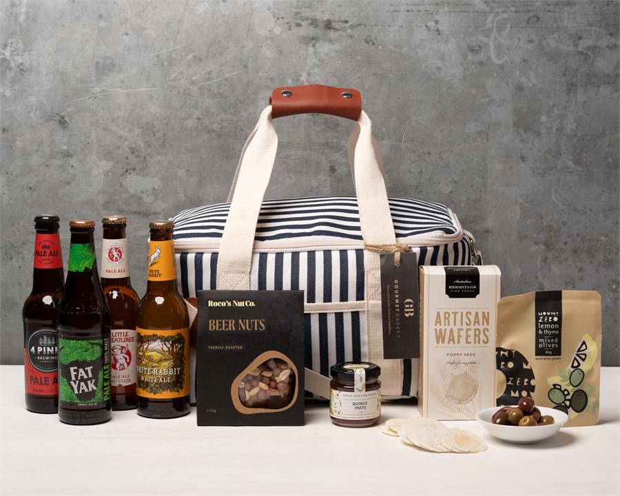 - Stylishly presented in our Gourmet Basket Navy Stripe Cooler Bag finished with ribbon, tissue and gift card
