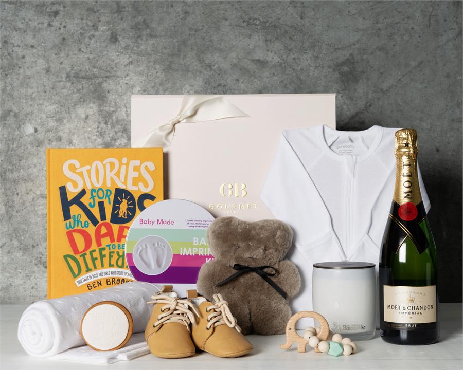 - Stylishly presented in our Gourmet Basket Signature Baby Gift Box finished with ribbon, tissue and gift card