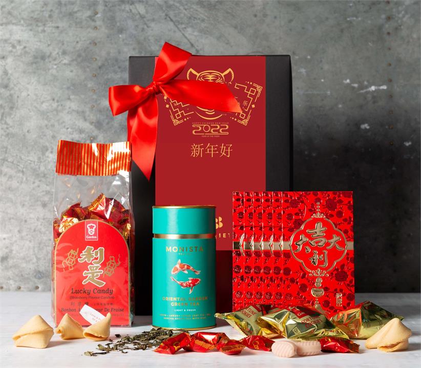 The perfect gift for Chinese New Year with tea, sweets, good luck and fortune.