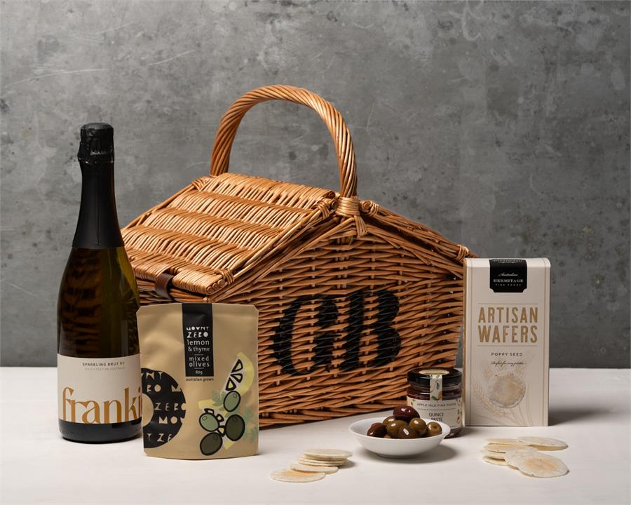 Gourmet Basket’s signature picnic basket with a bottle of sparkling and some treats to enjoy.