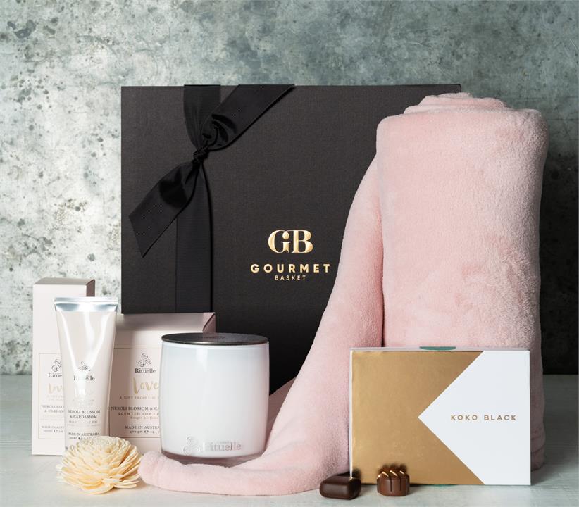 Send a beautiful gift to warm her heart & mind, filled with a soft throw, candle, notebook and pen, and chocolate fruit and nut mix.