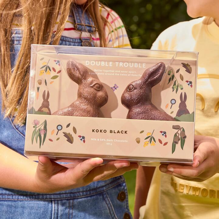 The chocolate twins of Koko Forest! These milk, and 54% dark chocolate bunnies are best when shared. The perfect gift for couples, best friends or someone who loves double of anything delicious. Two small hollow bunnies in creamy milk and deeply-rich Belgian dark chocolate.