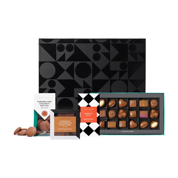 How’s this for an intergalactic celebration of our moreish milk chocolate! With the appropriately named Moreish Milk Block to start, weave through our Leatherwood Honeycomb and Caramelised Coconut Dotties to find yourself at a considered compendium of our most-loved milk chocolate pralines – the ideal gift or self-gift for classic chocolate fans.
