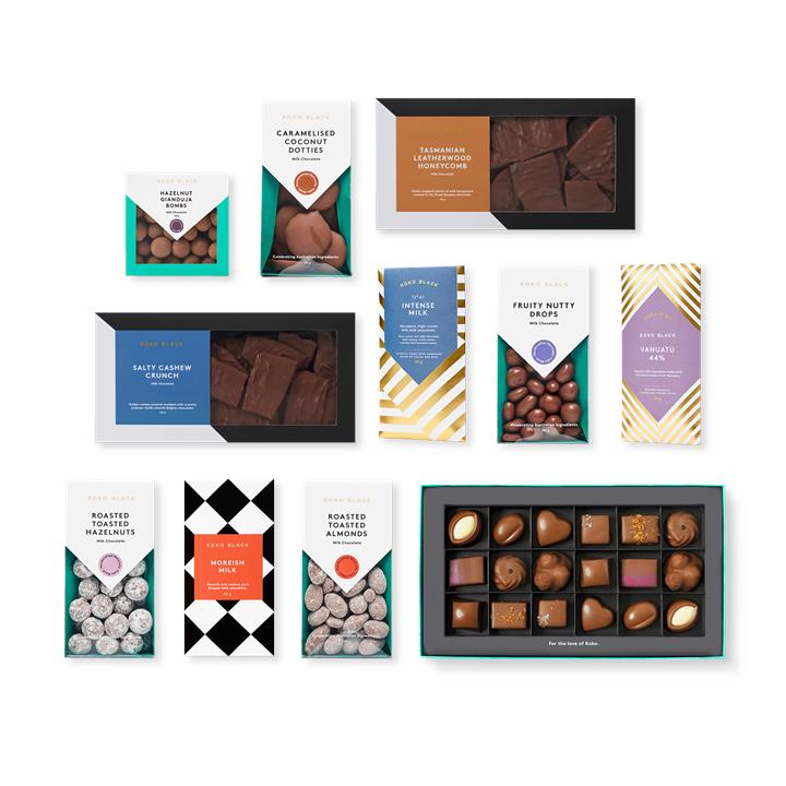 A silky, milky setup of milk chocolate classics! From Dotties, Nutty Drops and Bombs galore, there are milk chocolate blocks, Leatherwood Honeycomb and Salty Cashew Crunch on offer, plus toasted hazelnuts and almonds for the ultimate way to give the taste of milk chocolate.