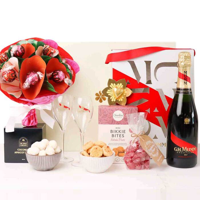 Luxury Champagne and Twin flute Gift Hamper is the perfect treat to indulge on together or as an independent gift. A mix of delicious chocolate treats and Mumm Champagne, in our signature, hamper boxes surrounded by a selection of savoury and sweet treats G.H. Mumm Grand Cordon Brut NVTwin Flute Gift Pack?; The Treat Co. – Coconut Apricot Balls,150g?; Charlies KakaduPlumBikkiBites 110g?; Rowe & Hunt – Raspberry Drops?; Chocolate Gold flower card? Lindt Chocolate Bouquet?; 4x Milk Lindtchocolates?; 4x Strawberry Lindt chocolate; Send this gift anywhere in Australia, including the option of Same Day Date Guaranteed to any major city. In regional areas we deliver with premium Star Track or Australia Post Express, however, these services do not come with a date guarantee.PS You’ll receive an email to track the progress of your delivery from the moment it leaves our doors.Interested in more nutritional information, click here.