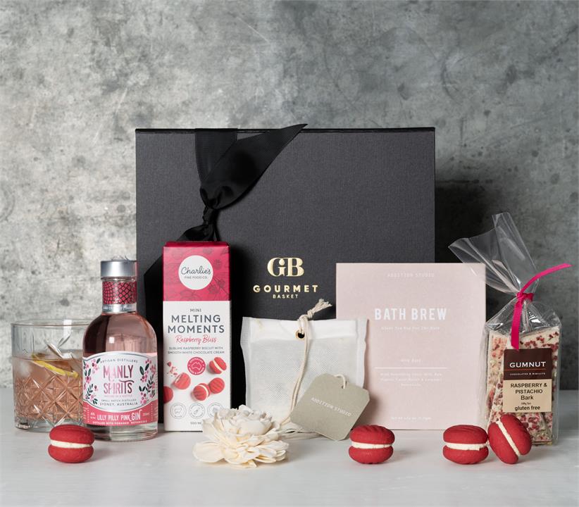 The Manly Spirits Pink Gin and Pamper Hamper is the perfect choice for the pink gin lover in your life. This decadent hamper features a bottle of Manly Spirits Pink Gin (great sipped neat or mixed), Gumnut White Chocolate Raspberry & Pistachio Bark, Charlies Mini Melting Moments Raspberry Bliss, Addition Studio Bath Brew Milk Bath and an Angel Aromatics Balsa Wood Flower. And what better way to enjoy your pink gin than with our luxurious pamper hamper? There is no better way to spoil yourself, or a loved one.