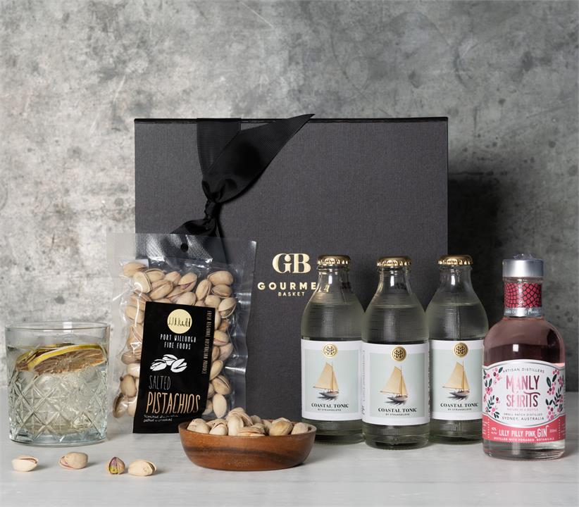 An ode to beautiful Australian produce. Our new Manly Spirits Pink Gin and Soda Hamper is proudly Australian made, owned and delicious. Featuring local Manly Spirits Lilly Pilly Pink Gin, a fabulously light Strangelove Coastal Tonic, Salt & Pepper Tumbler and South Australia’s Port Willunga Fine Foods Pistachios, send a refreshing taste of summer to your favourite people, thanks to local legends. The perfect way to enjoy a refreshing G&T on a hot summer day. Whether you’re a gin lover or looking to try something new, the Manly Spirits Pink Gin and Soda Hamper is the perfect way to enjoy a refreshing summertime drink.