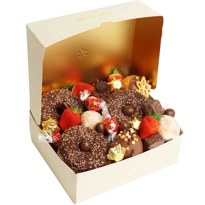This delicious dessert treat box has been packed to the brim with your all-time favourite milk chocolate goodies. We’ve got your afternoon sugar hit sorted. From delicious chocolate donuts, to irresistible freshstrawberries and we’ve even thrown in an assortment of little treats! *Freshzone delivery only please note that for all delivery locations outside of Sydney metro, Melbourne metro, Brisbane metro (includes Toowoomba, Gold and Sunshine Coast), Perth metro and Adelaide metro we are currently sending chocolates and gift hampersonly. This gift box includes: 3 Chocolate Ring Donuts?; 4 Gourmet Crispearl Donuts?; 4 Fresh Strawberries?; 2 French Filled Powdered Donuts?; Chocolate surpriseassortment that could beFruChocs, Speckles,Chocolatier Australia milkchocolate hearts, creamyLindor balls and more.; Signature gold Edible Blooms gift box; A message card for a personalised note; Delivered in our signature deliverybox or carry bag (pictured); *Our donuts arebest eaten on the day they are delivered. Interested in more nutritional information, click here.