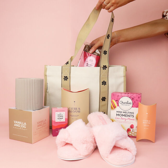 A unique take on a pamper hamperOur Pamper Tote merges gorgeous pamper items and deliciously indulgent treats all with astunning canvas tote bag. All items are packed in our medium-sized canvas tote bag, an everyday essential bag,the perfect giftto be pampered like a queen in style. Edible Blooms Canvas Tote Bag – medium; (100% Cotton Canvas, 35cm wide, 27cm high, 11cm base/depth); Small Town Soap Co – Hope Bar 135g; In Bloom – Lip Balm; In Bloom – Hand & Nail Cream; Dancing Monkey – Rocky Road, 200g; Plush Pink Slippers- colours may vary; Vanilla and Fig Large Candle; Charlies – Mini Melting Moments Coco Berry Monte 100g; Gift card; Send this gift anywhere in Australia, including the option of Same Day-Date Guaranteed in Adelaide. Standard delivery in all other states. In regional areas we deliver with premium Star Track or Australia Post Express, however, these services do not come with a date guarantee.PS You’ll receive an email to track the progress of your delivery from the moment it leaves our doors.Interested in more nutritional information, click here.