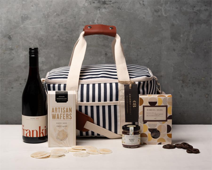 - Stylishly presented in our Gourmet Basket Navy Stripe Cooler Bag finished with ribbon, tissue and gift card