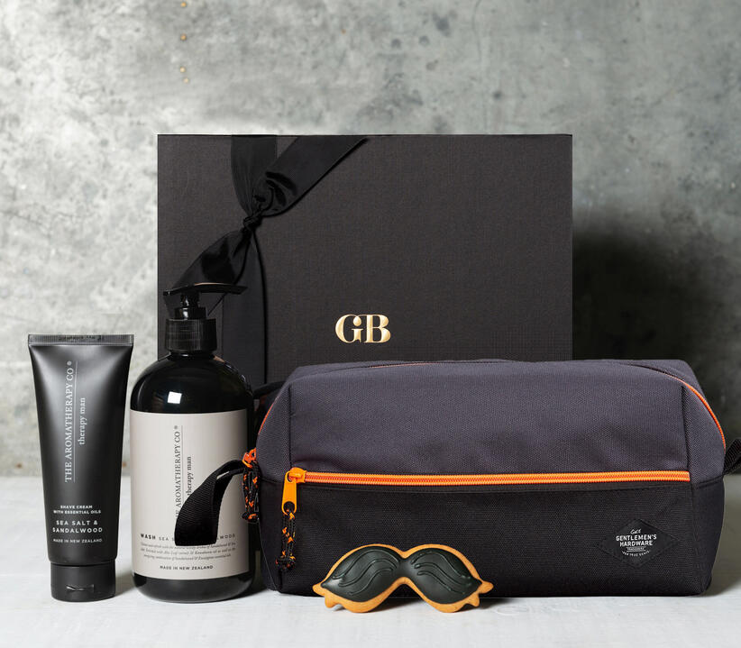The perfect hamper for the travelling gent! Keep all his grooming essentials at hand with this water-resistant canvas wash bag, filled with hand & body wash and shaving cream.