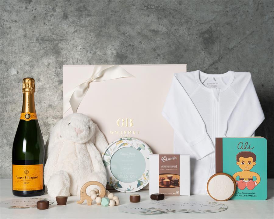 - Stylishly presented in our Gourmet Basket Signature Baby Gift Box finished with ribbon, tissue and gift card