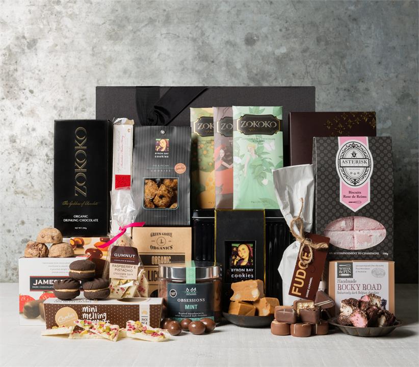 This decadent gift basket includes a range of quality hand made gourmet chocolates and biscuits. Delectable handmade fudge, delicious chocolates, addictive Byron Bay biscuits, delightful rocky road and melt in the mouth mini melting moments.
